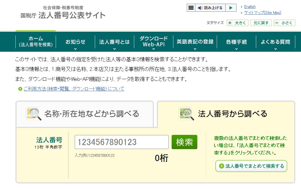法人番号は、こちらの法人番号好評サイトで調べられます。