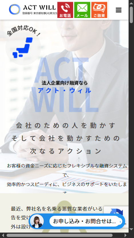 | アクト・ウィル | 8.00〜15.00% | 5,000万円まで | 1.0〜3.0% | 最短即日 | 12ヶ月以内 | 全国 |