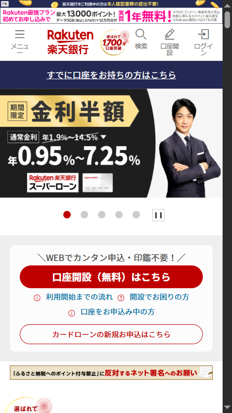 | 楽天銀行 | 1.93~10.69%(5年見直し) | 100万円~1億円未満 | 2.2%(最低38,500円) | 3週間から1ヵ月 | いずれか短いほう ・1年~25年 ・完済時年齢が満80歳となるまでの期間 | 全国 |